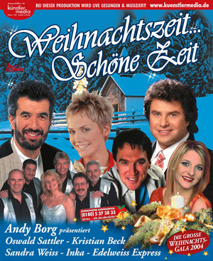 Auch 2004 tourte INKA zur Weihnachtszeit durchs Land. Andy Borg führte auf seine fröhliche Art durchs Programm. Neben INKA und Andy traten noch Sandra Weiss, Kristian Beck und Oswald Sattler auf. Alle Künstler wurden live von der Maryland Showband begleitet. INKA sang im ersten Block "Mein Herz bleibt bei Dir", "Florian" und ihr Oldymedley. Im zweiten Teil wurde es unter anderem mit "Oh, du fröhliche" weihnachtlich. Gemeinsam mit dem Publikum sangen alle Künstler als Abschluß "Stille Nacht, heilige Nacht". Da Andy am 20.12. eine Fernsehsendung aufzeichnetet, moderierte INKA an diesem Tag die Weihnachtsgala. |